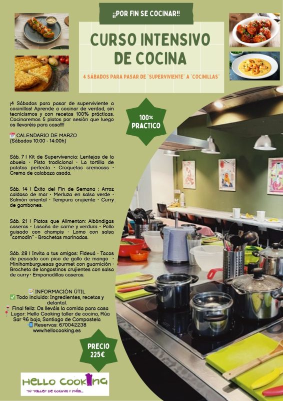 Durante 4 sábados de marzo (10:00 a 14:00h), nos pondremos el delantal para preparar un menú completo en cada sesión.